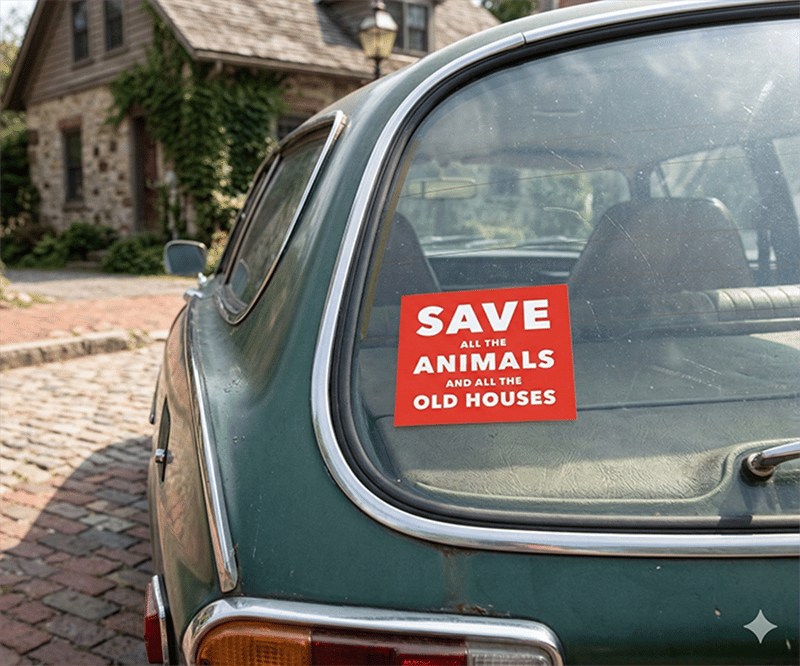 Our “Save all the Animals and All the Old Houses” bumper sticker is a fan favorite!