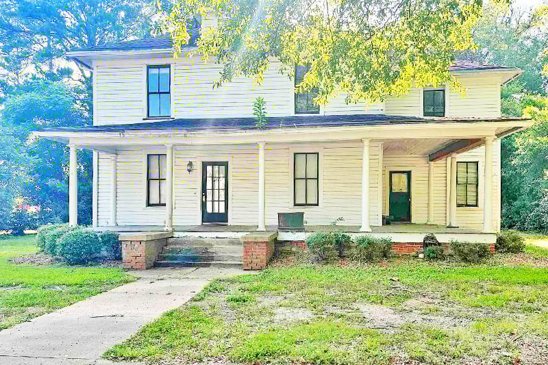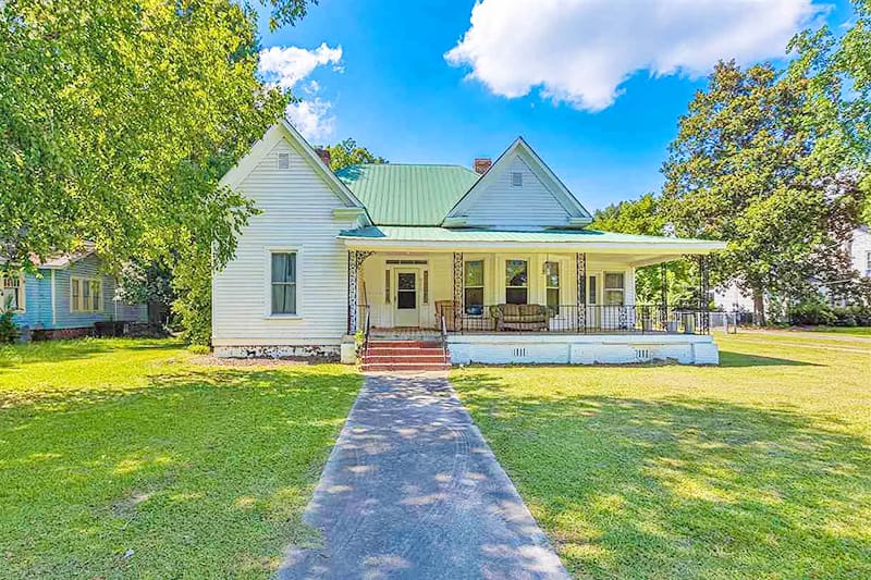With over 2,400 square feet, this home with a lot of character offers great opportunities to put your custom touches on it. The unique touch of a Southern-style huge covered porch with bay windows provides living space for socializing, relaxing, and enjoying the outdoors. The property includes three bedrooms and two full bathrooms, along with a great room, dining room, kitchen, and sunroom, all filled with natural light and ample storage space. The great room boasts high ceilings, original hardwood floors, chair molding, and a cozy fireplace. Open the French doors to the dining room with a fireplace and a built-in bookcase. The dining room flows into a spacious kitchen with plenty of cabinetry and countertop space. The sunroom exudes a rustic ambiance with its natural lighting and knotty pine paneling,